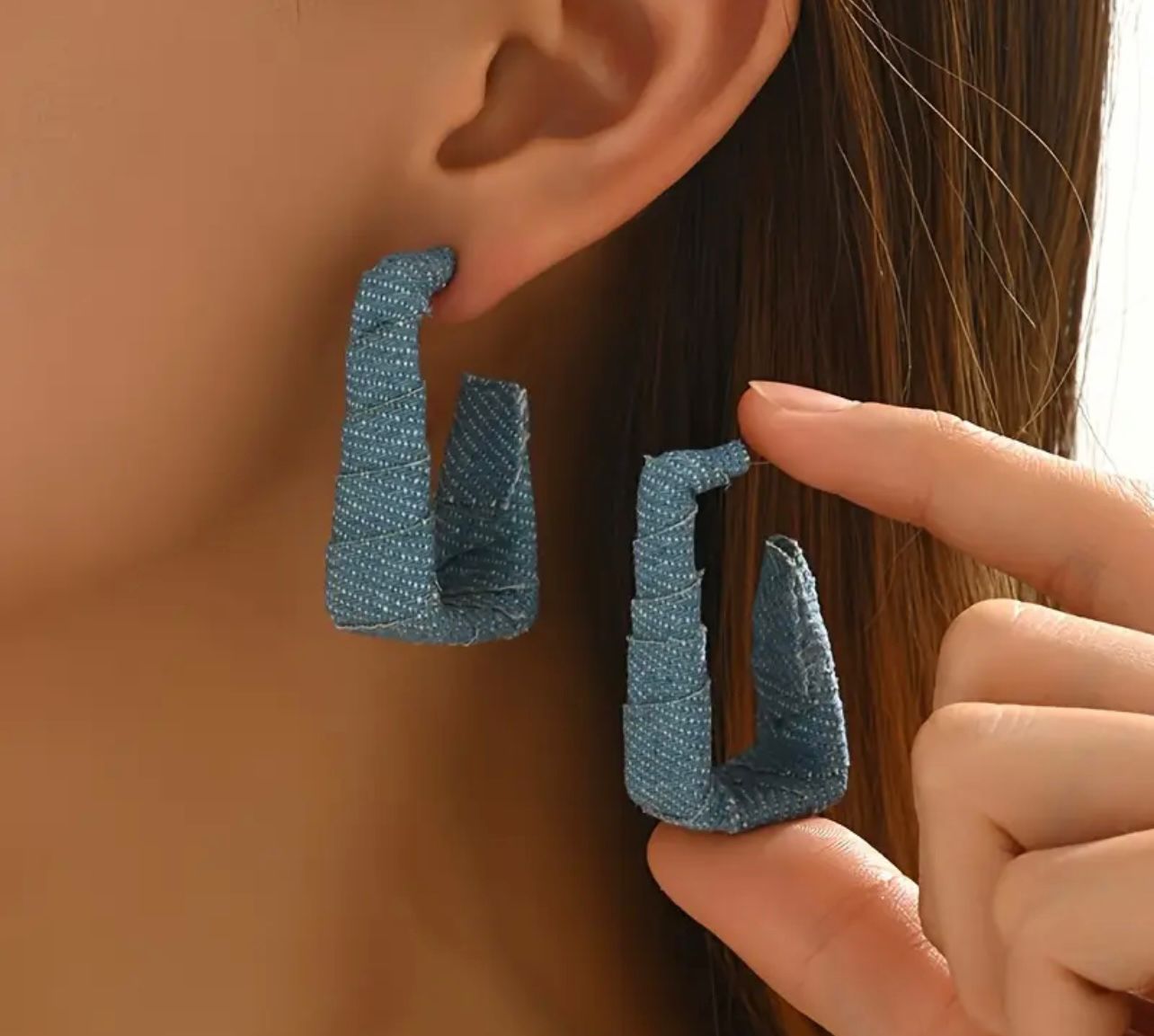 Tasarım: Açık mavi denim kumaşla sarılı U form/kare halka görünümünde modern küpe.